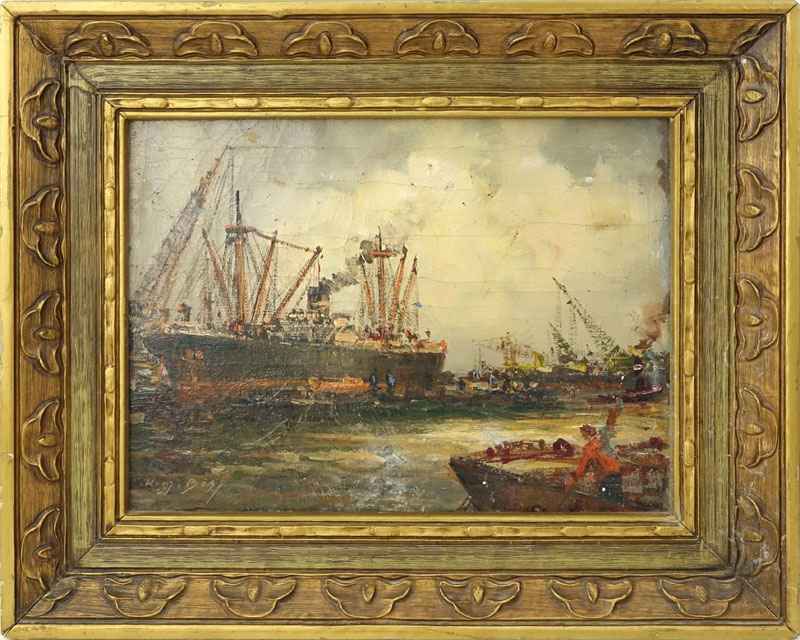 Willem Bos, Dutch (1906-1974) Oil on Canvas "Busy Harbour" Signed Lower Left. Depicts an abstract busy harbor scene with multiple ships in the water. Some losses to canvas, craquelure otherwise good condition. Measures 11-1/2" H x 15-1/4" W (sight), frame measures 17-3/4" H x 21-3/4" W. Shipping $85.00 (estimate $100-$150)