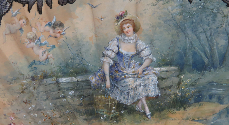 Antique Hand Painted Paper, Lace and other Of Pearl Ladies Fan. Unsigned. Typical wear. Measures 14" L x 27" Wide when opened. Shipping $35.00 (estimate $200-$300)