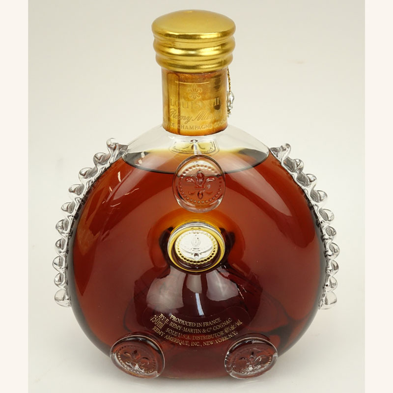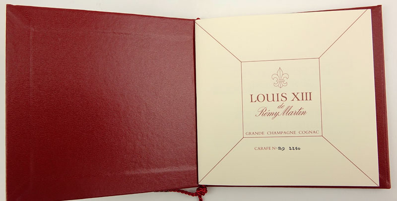 Baccarat Louis XIII Grande Champagne Cognac Crystal Decanter in Original Display Box. Decorated with crystalline lacework, fleur-de-lis applied seals, and crystal Fleur-de-lis stopper. Includes corresponding documentation. Numbered "BD2250" on underside. Good condition. Measures 8-3/4" H. Shipping: Third party (estimate $500-$700)