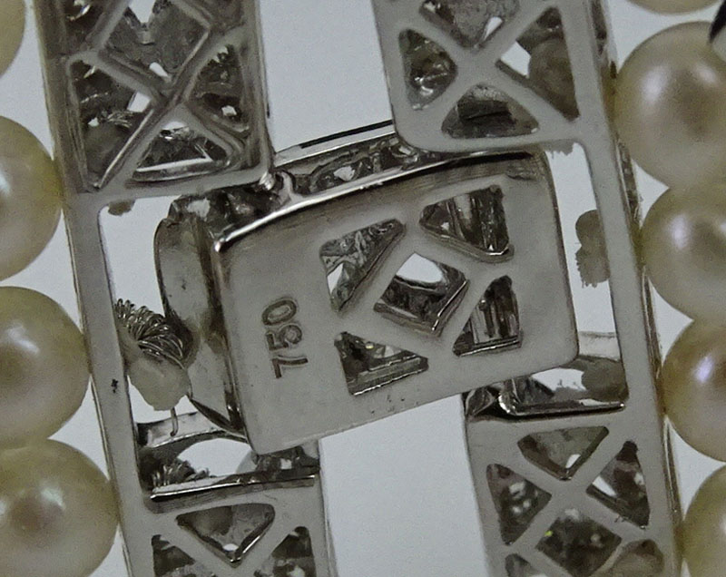 Edwardian style Five Row Pearl, 1.94 Carat Diamond and 18 Karat White Gold Bracelet. Pearls measure 4mm. Stamped 750. Very good condition. Measures 7" L, 7/8" W. Approx. weight: 36.7 grams. Shipping $32.00 (estimate $3000-$4000)