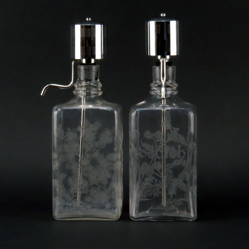 Grouping of Seven (7) Tabletop Items. Includes: two vintage pump decanters, pair of Swarovski candlesticks (minor flea bites), Saks Fifth Avenue crystal wine taster, glass dish (nicks), and carved wood multi spout low bowl (chips to spout). Decanter measures 10-3/4" H. Provenance: Property of Irving Cowan and the late Marjorie Friedland Cowan, Hollywood, Florida. Thoroughbred horse breeder/owners, Breeders’ Cup winners, Hollywood Wildcat and War Chant. Former owners of The Diplomat Hotel, Hollywood. Shipping: Third party (estimate $100-$150)