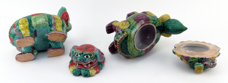 Pair of Antique Chinese Painted Porcelain Foo Dog Censors. Unsigned. Minor paint loss or in good condition. Measures 7" H x 9" L. Shipping $68.00 (estimate $300-$500)