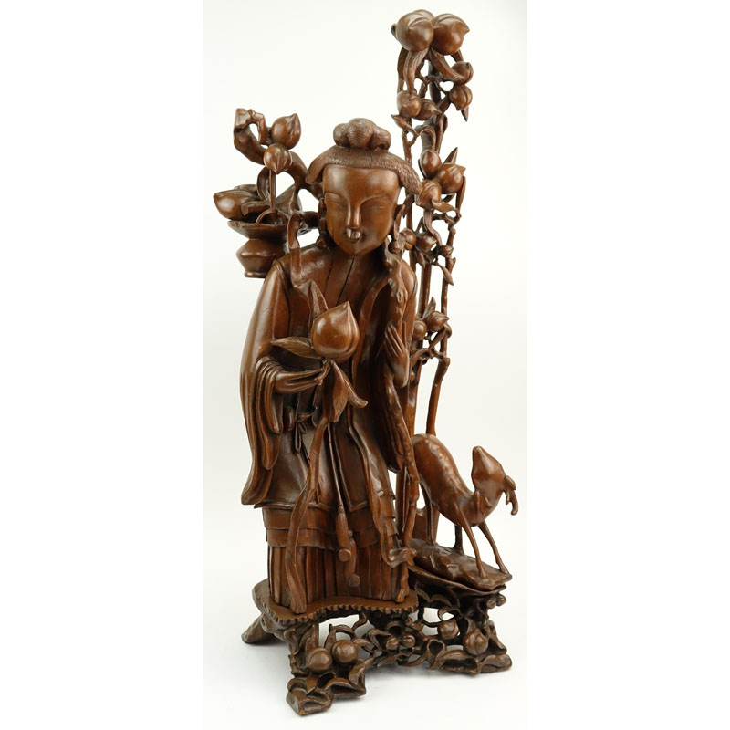 Large Chinese Guanyin Carved Wood Sculpture. Comes apart into 4 pieces. Some age splits to surface. Measures 36-1/2" H x 13" W. Provenance: Property of Irving Cowan and the late Marjorie Friedland Cowan, Hollywood, Florida. Thoroughbred horse breeder/owners, Breeders’ Cup winners, Hollywood Wildcat and War Chant. Former owners of The Diplomat Hotel, Hollywood. Shipping: Third party (estimate $600-$800)