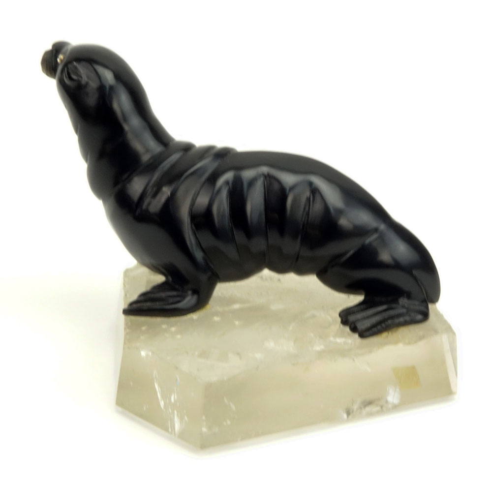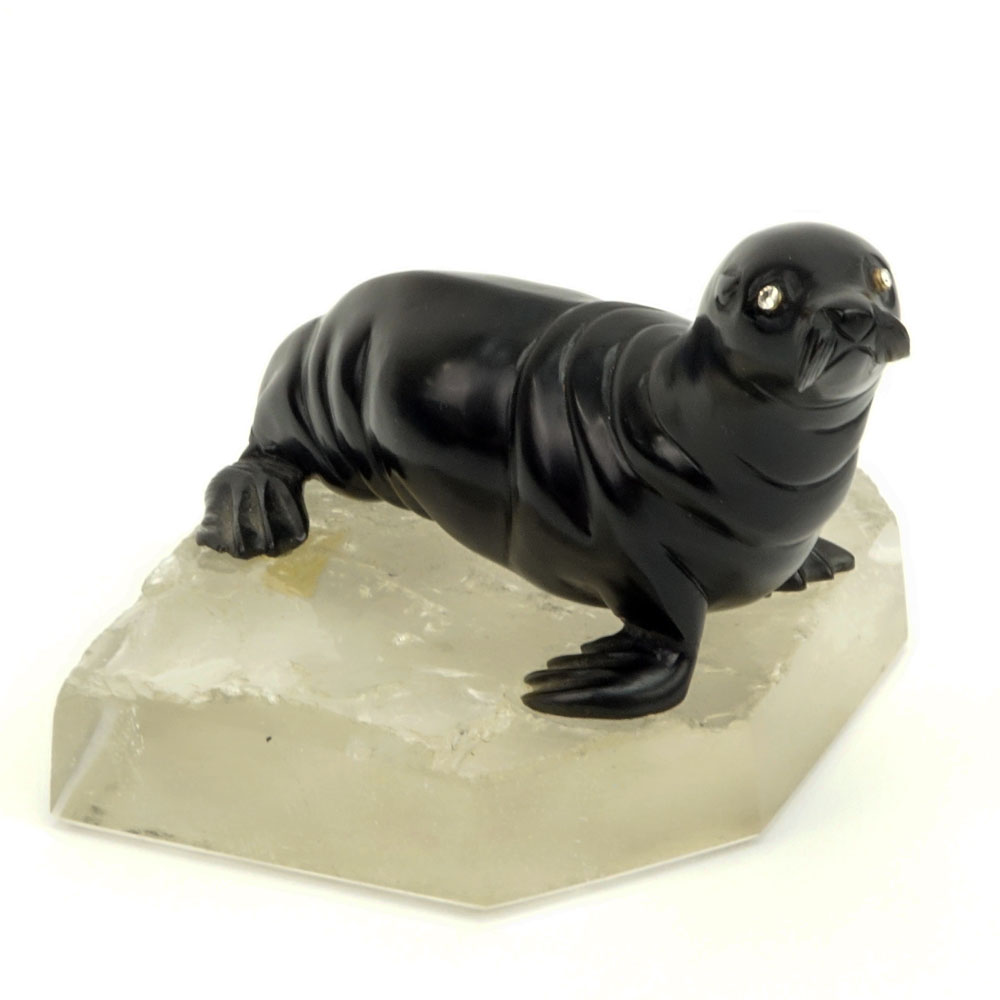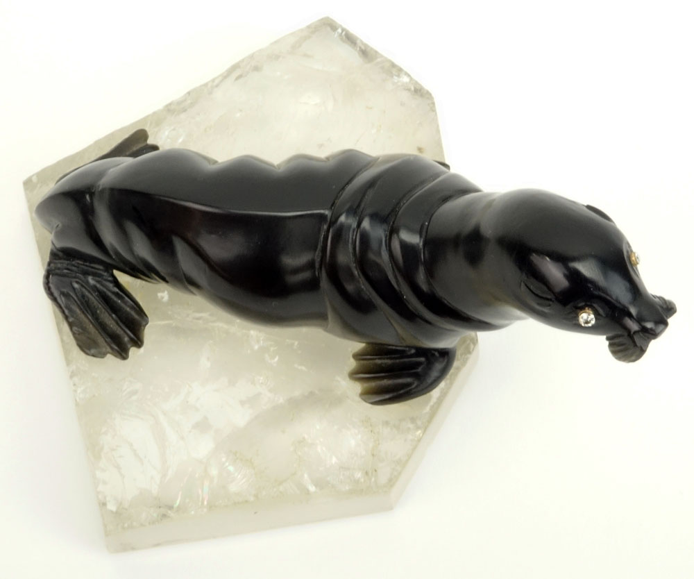 20th Century Russian Carved Obsidian Seal with Rose Cut Diamond Eyes on Carved Rock Crystal base. Unsigned. Good condition. Measures 2-5/8" H, 4-1/2" W. Shipping $40.00 (estimate $1700-$2500)