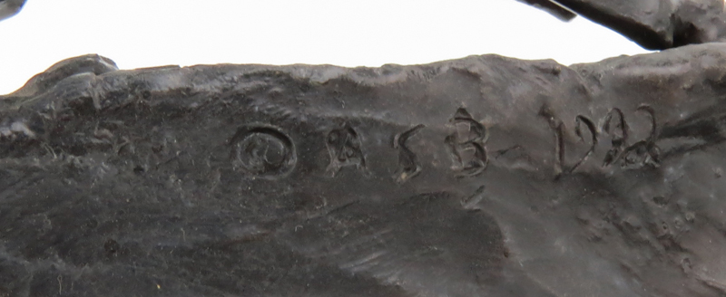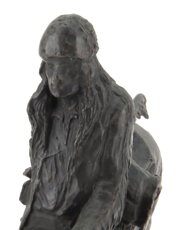 After: Frederic Remington, American (1861-1909) "Mountain Man" Bronze Sculpture on Marble Base. Signed, tag with name and title affixed to base. Some wear to patina, needs cleaning. Measures 14-1/4" H x 8" Long, base measures 1-1/2" H x 6" W. Shipping $135.00 (estimate $150-$250)