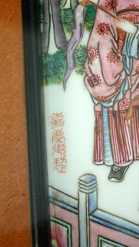 Mid Century Chinese Wooden Glass Top Coffee Table Mounted with Three Chinese Enamel Hand Painted Porcelain Plaques. All plaques are signed and depicts various courtyard scenes. Table has scuff to edges and minor rubbing otherwise good condition. Table measures 18" H x 48" W x 24-1/2" Depth, plaques measures 11-1/2" H x 8-1/2" W (sight). Shipping: Third party (estimate $300-$500)