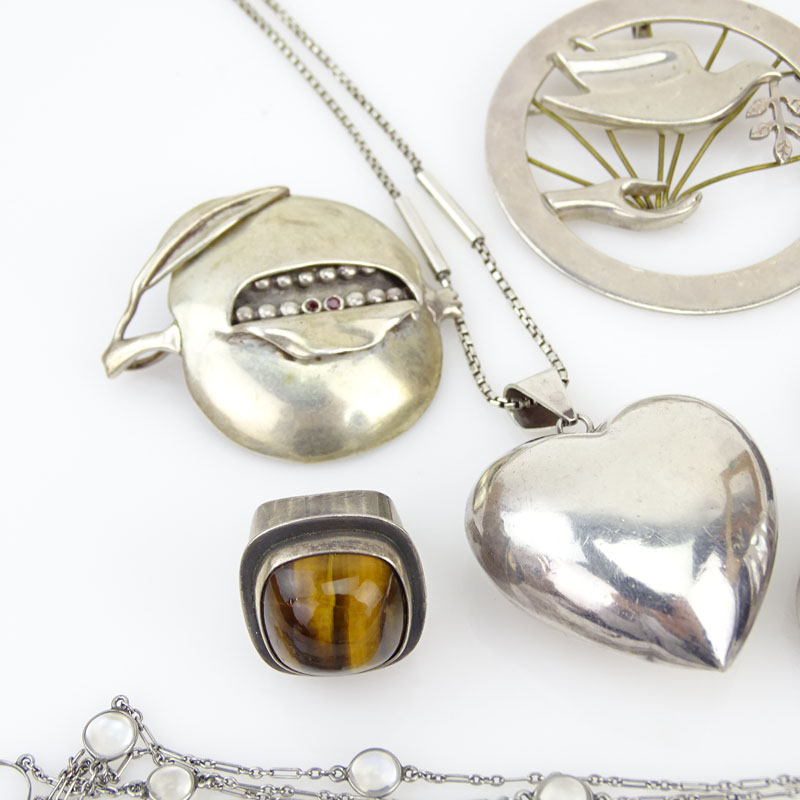 Seven (7) Piece Sterling Silver Jewelry Lot Including: One Necklace with Moonstones; A Necklace with Heart Pendant; A Modern Design Five Circle Pendant; A Ring with Tiger-eye; A Ring with Onyx; A Brooch with Dove; A Persimmon Brooch. Variously signed sterling. Surface wear from normal use. Hear pendant necklace measures 31" L, heart pendant measures 2" L, 1'1/2" W. Ring sizes 5 and 8. Approx. weight: 136.1 grams. Shipping $36.00 (estimate $100-$150)