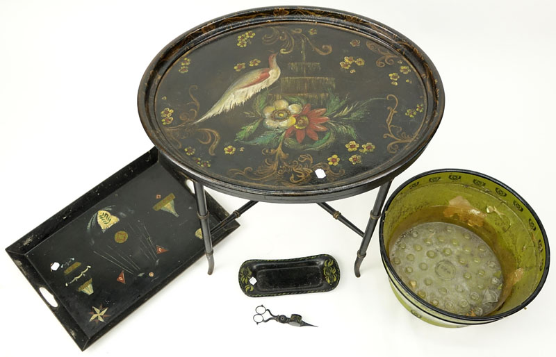 Grouping of Five (5) Vintage Toleware Items. Includes: large oval tray on wooden stand, large handled serving tray, large jardinière bowl, small dish and candle snuffer scissors. Wear and scratches to surface, rubbing. Largest measures 25-1/4" Wide, smallest measures 6-1/2" Long. Shipping: Third party (estimate $100-$150)