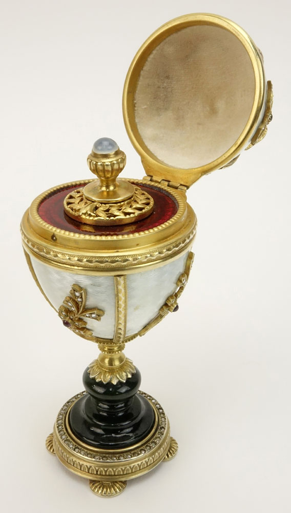 Early 20th Century Russian 88 Silver, Nephrite Jade and Guilloche Enamel Egg with Rose Cut Diamond and Gemstone accents in fitted case signed Faberge. Stamped Faberge, 88 Kokoshnik and ?? mark. Good condition. Measures 5" H, 1-7/8" W. Shipping $38.00 (estimate $6500-$8000)