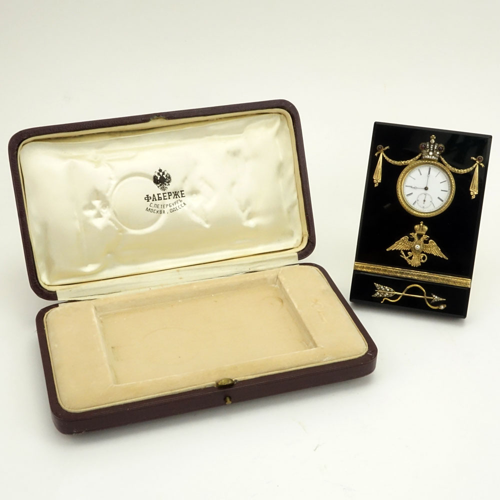 20th Century Russian 88 Gilt Silver Mounted Black Onyx Desk Clock accented with Rose Cut Diamonds and Cabochon Garnets in fitted box signed Faberge. Back of clock Signed Faberge, ?? and 88 Kokoshnik. Good condition, no key. Measures 5-3/8" H, 3-1/2" W. Shipping $68.00 (estimate $2800-$4000)
