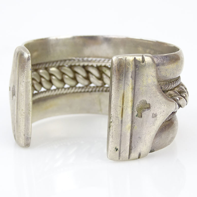 Vintage Persian Heavy Silver Cuff Bangle Bracelet. Hallmarked. Surface wear from normal use. Measures 1-3/8" W, 2-1/4" interior diam. Approx. weight: 159.9 grams. Shipping $32.00 (estimate $200-$300)
