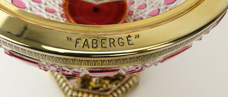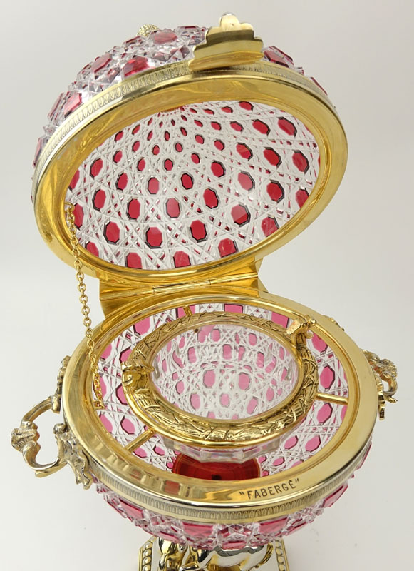 Fine Faberge Ruby Cut to Clear Czar Alexander Caviar Server. Ornate scroll work to handles with acorn finial, spherical body hinged at the center to display the caviar bowl and carrousel style chevaux base. Signed "Faberge" on interior rim. Minor gilt wear, needs a slight cleaning otherwise good condition. Measures 19" H x 12-1/2" W. Shipping: Third party (estimate $2000-$3000)
