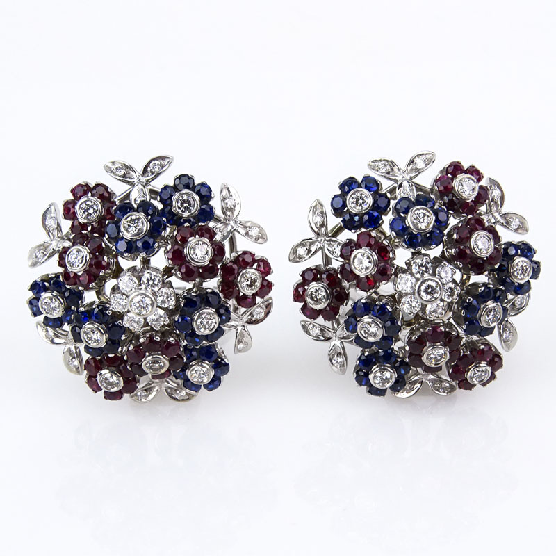 Very Fine Vintage Cartier, France Diamond, Ruby, Sapphire and 18 Karat White Gold Trembler Earrings. Superb quality stones throughout. Rubies and sapphires with vivid saturation of color. Diamonds D-E color. VS clarity. Signed Cartier, French hallmarks. Very good condition. Measure 1-1/8" diameter. Approx. weight: 39.7 grams. Shipping $30.00 (estimate $15000-$20000)