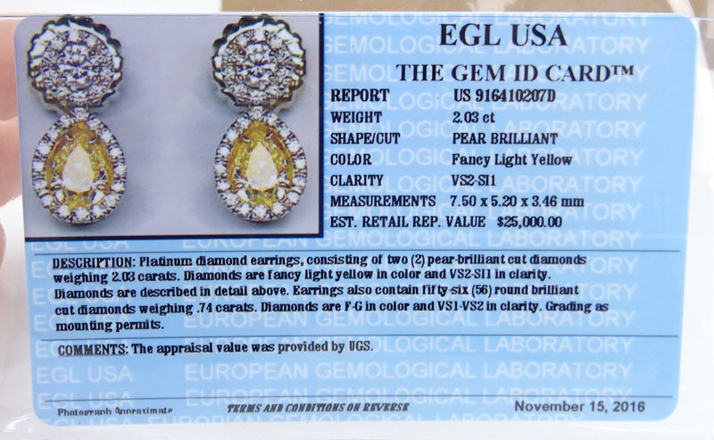 EGL Certified 2.03 Carat Pear Shape Fancy Light Yellow Diamond and Platinum Pendant Earrings Accented throughout with .74 Carat Round Brilliant Cut Diamonds. Yellow diamonds VS1-SI1 clarity. White diamonds F-G color, VS1-VS2 clarity. Unsigned. Very good condition. Measure 3/4" L, 3/8" W. Approx. weight: 5.9 grams. EGL Report US946410207D dated 11/15/16 to accompany this lot. Shipping $30.00 (estimate $7000-$10000)