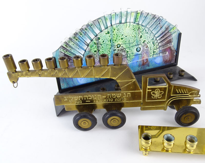 Three (3) Modern Judaica Menorahs. Unsigned. The piece with the glass backplate has some losses to glass and one candle holder loose but included. Glass backed piece measures 6-1/4" H x 11-3/8" L. Shipping $59.00 (estimate $100-$200)