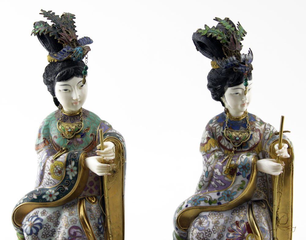 Pair of 20th Century Japanese Cloisonné and Ivory Geisha Figurines on Wooden Base. Depicts 2 geishas in traditional garb with ivory face and hands. Good condition. Measures 8-3/4" H x 3-1/4" W. This item will only be shipped domestically and was legally imported into the United States. Shipping to California, Connecticut, New Jersey and New York is Not Available for this Lot. Shipping $58.00 (estimate $400-$600)