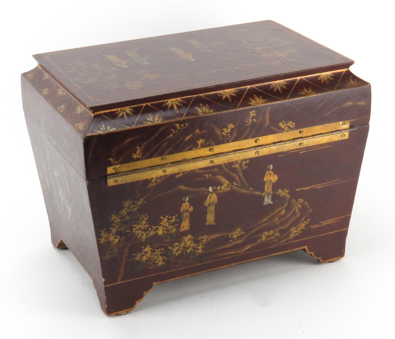 Vintage Chinese Painted and Gilt Decorated Box. Unsigned. Surface wear, rubbing, small losses to finish. Measures 10-1/2" H, 14-1/2" W. Shipping $85.00 (estimate $50-$100)
