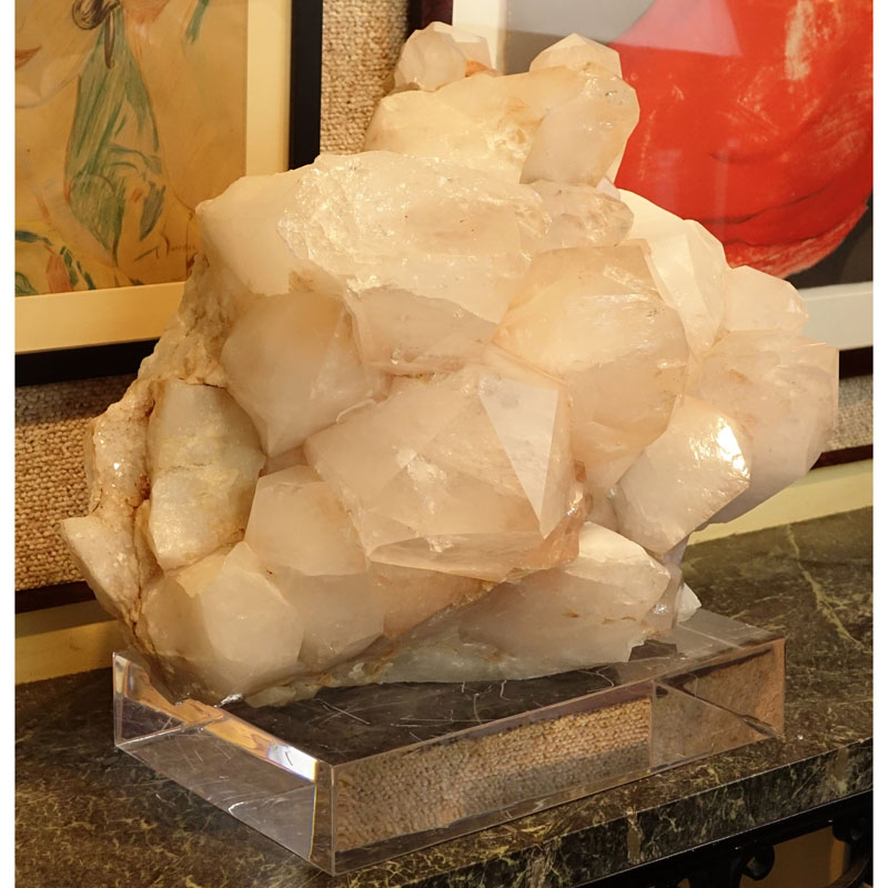 Possibly Minas Gerais, Brazil Massive 212 Lbs. Natural Rock Quartz Crystal Mineral Specimen on Lucite Base. Multiple large sharp faceted quartz crystals. Natural inclusion and wear to surface, scratches to Lucite. Specimen measures 18" H x 22" W x 14" Depth, base measures 3" H x 17" W x 11" Depth. Weighs 236 Lbs. with base. Shipping: Third party (estimate $1000-$2000)