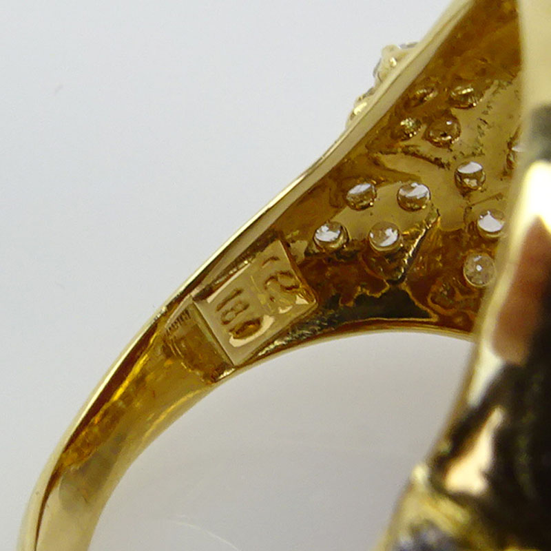 Approx. 40.27 Carat Cabochon Burma Ruby, 1.79 Carat Round Brilliant Cut Diamond and 18 Karat Yellow Gold Ring. Ruby with vivid saturation of color. Signed 18K. Very good condition. Ring size 6. Approx. weight: 18.4 grams. Shipping $28.00 (estimate $20000-$25000)