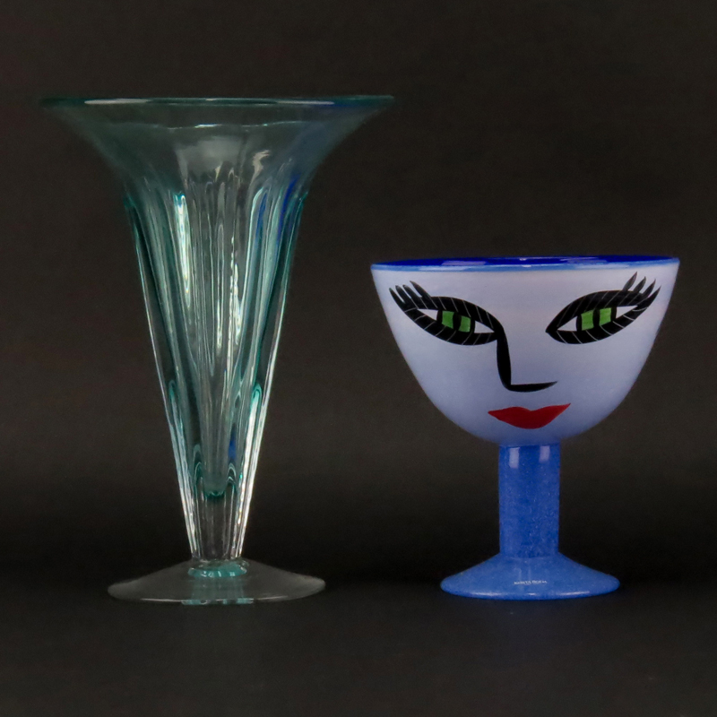 Vintage Murano Glass Vase together with Modern Kosta Boda Footed Compote. Vase unsigned. Kosta Boda with sticky tag and artist signed. Good condition. Vase measures 11-3/8" H, 8-1/8" W (at rim). Shipping $125.00 (estimate $50-$100)