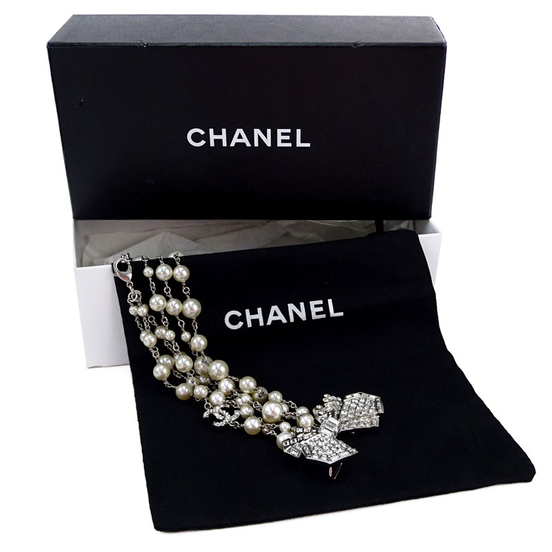 Chanel Faux Pearl, Crystal Bow, CC Three Strand Necklace