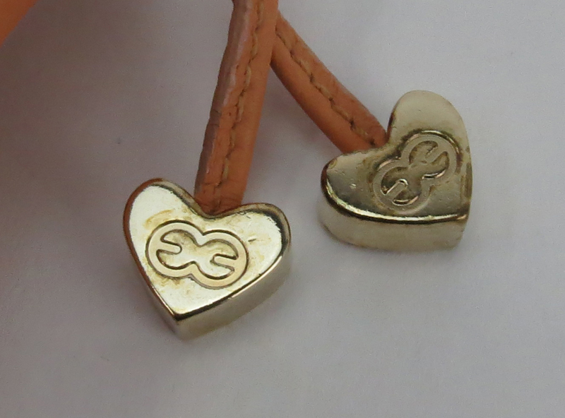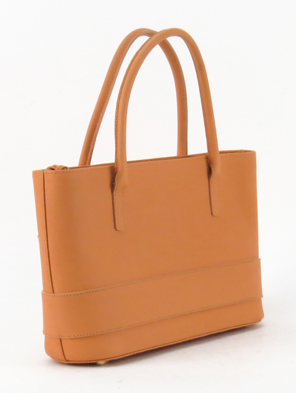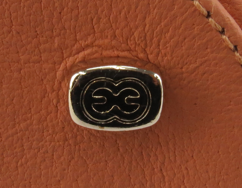 Escada Peach/Salmon Leather Top Handle Handbag. Features zipper closure, monogrammed fabric interior, gold-tone hardware. Marked appropriately. Gently used condition with minor soiling. Measures 7" H x 12-1/4" W x 3-1/8" D. Dust bag included. Shipping $52.00 (estimate $200-$250)