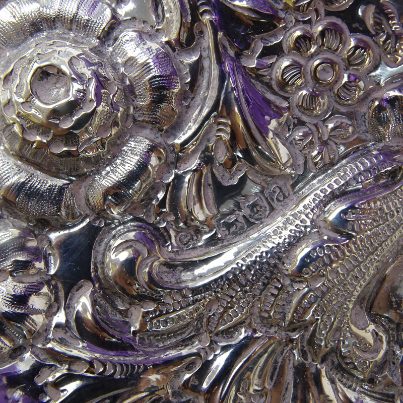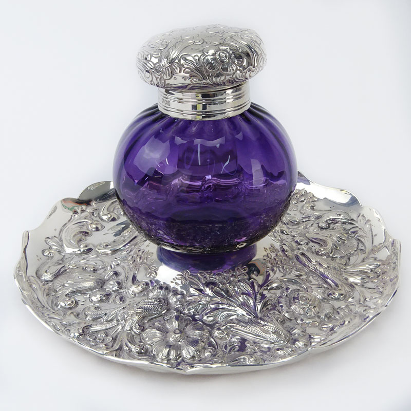 19th Century English Silver and Glass Inkwell and Tray. The set features an amethyst round glass bottle with a repousse decorated lid and rests on a large round repousse tray. Bears the hallmark of Charles Boyton, London, 1896. Good condition with a minor ding in tray. Bottle measures 5-1/2" H, tray measures 9-1/8" Dia and weighs approx. 9.49 troy ounces. Shipping $62.00 (estimate $400-$600)