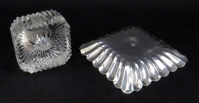 20th Century Sterling and Glass Inkwell and Tray. This set boasts a sterling tray with a glass bottle and sterling hinged lid. Signed STERLING. Small chips and bottom scratches on bottle or in overall good condition. Bottle measures 4" H, tray measures 6" x 6" and weighs approx. 6.96 troy ounces. Shipping $54.00 (estimate $200-$400)