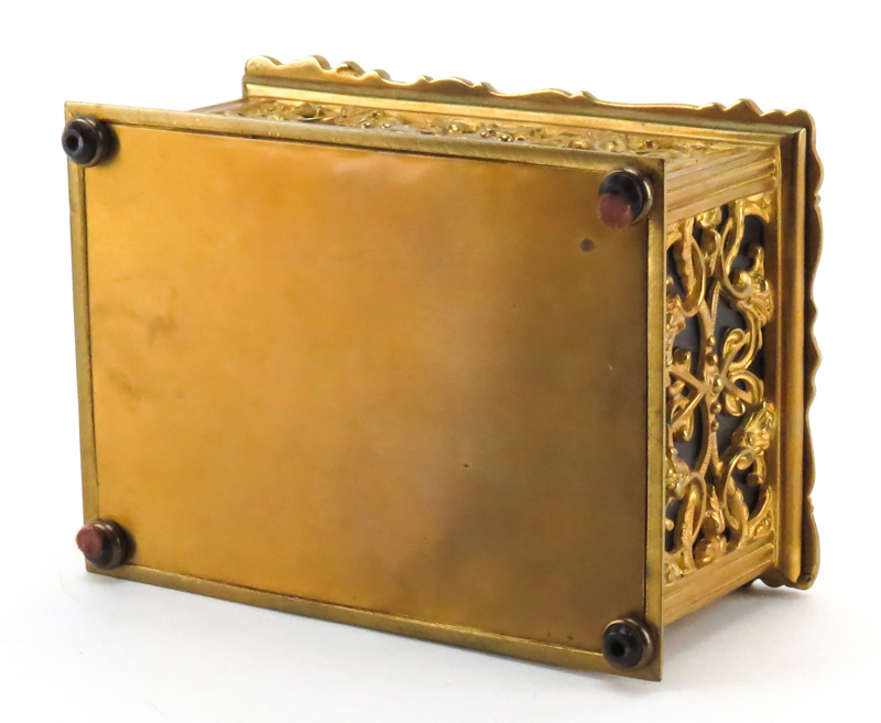 Antique Art Nouveau Gilt Bronze and Leather Box. Nymph relief to top with scroll and foliage motif. Cedar lined interior. Rubbing, gilt wear. Measures 4" H x 8" W x 5-3/4" Depth. Shipping $48.00 (estimate $200-$400)