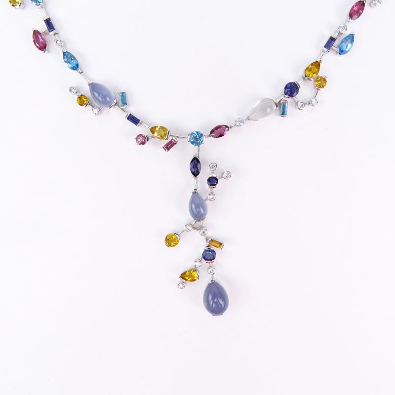Cartier style 53.16 Carat Multi Color Gemstone, 1.48 Carat Diamond and 18 Karat White Gold Necklace.