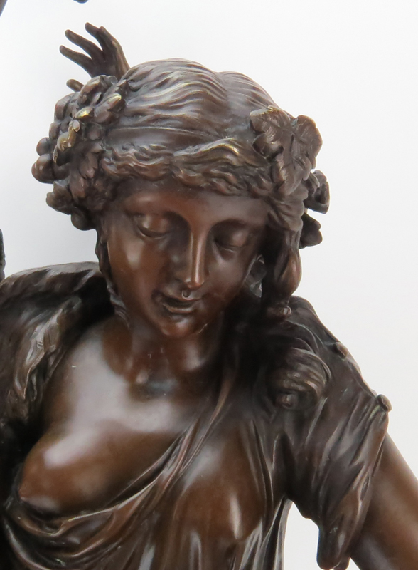 After: Claude Michel Clodion, French (1738-1814) "Bacchanalia" Bronze Sculpture. Early to mid 20th century. Depicts a dancing satyr with young nymphs. Numbered 2854 on obverse side. Wear to patina and rubbing, possible old professional restoration to one arm. Measures 30" H x 14" W. Shipping: Third party. (estimate $1000-$1500)
