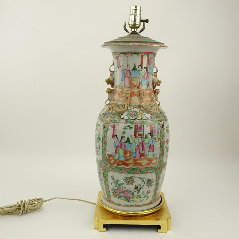 Late 19th or Early 20th Century Chinese Rose Medallion Porcelain Vase Mounted as Lamp. Enamel painted panels of courtyard scenes, birds, insects with mock gilt dragon handles. Rubbing to gilt. Measures 24" H. Shipping: Third party. (estimate $300-$400)
