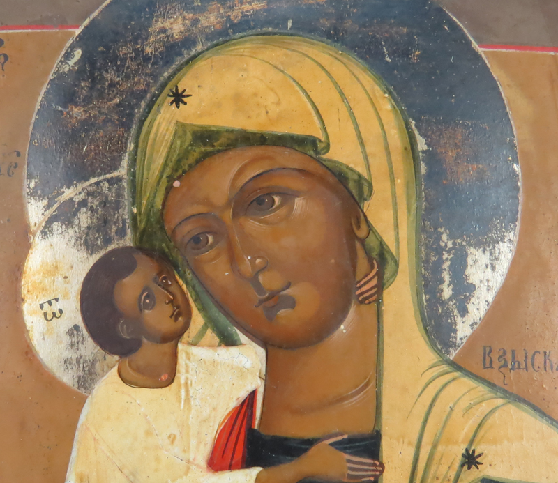 20th Century Russian Hand Painted Icon On Wood. Unsigned. Wear, rubbing and losses. Measures 12-1/8" x 10-1/2". Shipping $69.00 (estimate $300-$400)