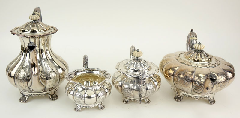 Barkers Ellis Four Piece English Silver Plated Tea Set. Includes Tea pot, coffee pot, sugar and creamer. Stamped. Needs cleaning otherwise good condition. Coffee pot measures 8-1/2" H. Shipping $110.00 (estimate $300-$500)