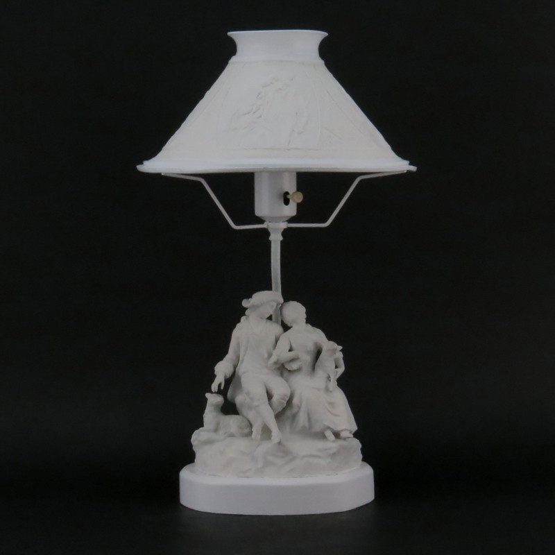 Pair of Vintage Bisque Porcelain Figural Lamp With Lithopane Shade. Shade marked FRANCAISE LITHOPHAINE. Wear, losses, restoration and paintloss. Measures 20" H. Shipping: Third party. (estimate $150-$250)