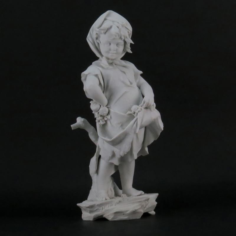 19/20th Century German Volkstedt Bisque Porcelain Young Girl Figurine. Signed with blue hayfork mark on underside. A few old professional restorations, nicks, needs cleaning. Measures 17-1/2" H x 6-1/2" W x 7" Depth. Shipping: Third party. (estimate $200-$300)