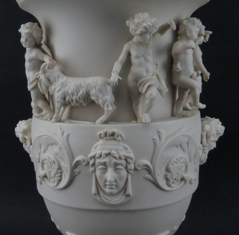 19/20th Century Sevres Style Bisque Figural Lamp with Cherub Finial. Unsigned. Some old professional restorations, nicks and chips. Measures 40" H. Shipping: Third party. (estimate $100-$200)