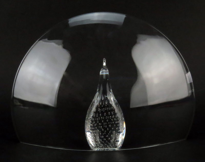 Steuben "Peacock" Clear Crystal Centerpiece Figurine. Clear with controlled bubbles on interior of the figurine. Signed on underside. Good condition. Measures 10-1/4" H x 14-1/2" W. Shipping $125.00 (estimate $300-$500)