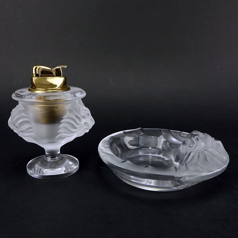 Two (2) Piece Lalique "Tete De Lion" Crystal Smoking Set. Includes lighter and ashtray. Signed. Good condition. Lighter measures 5" H. Shipping $58.00 (estimate $100-$150)