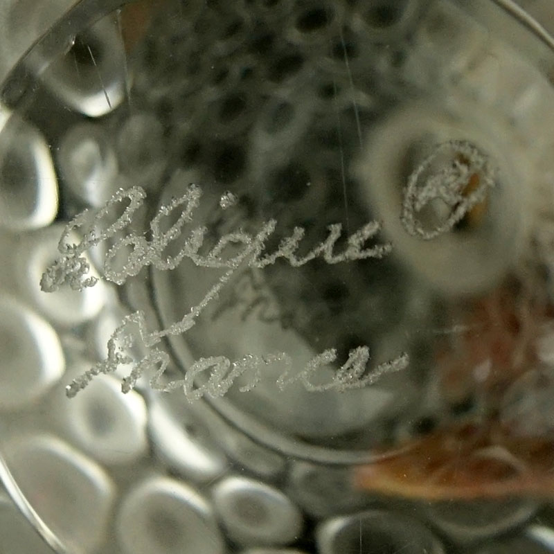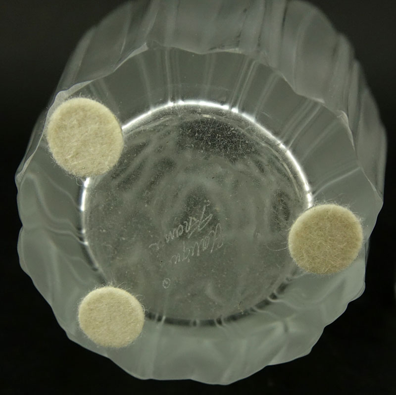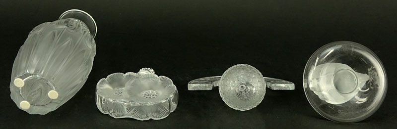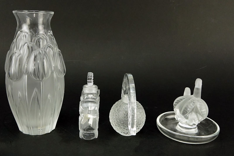Grouping of Four (4) Lalique Crystal Tableware. Includes: "Tulips" vase, "Deux Fleurs" perfume bottle, "Folie" perfume bottle, and "Deux Cygnes" ring/pin tray. All signed appropriately. Minor cleaning otherwise good condition. Tallest measures 7" H. Shipping $56.00 (estimate $250-$350)