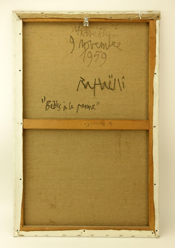 Mid-Century Oil On Canvas. Signed Raffaelli. Titled "Beltes a la pomme" and dated Marseilles 8 Novembre 1959. Good condition. Measures 36-1/2" x 23-3/4". Shipping $125.00 (estimate $200-$400)