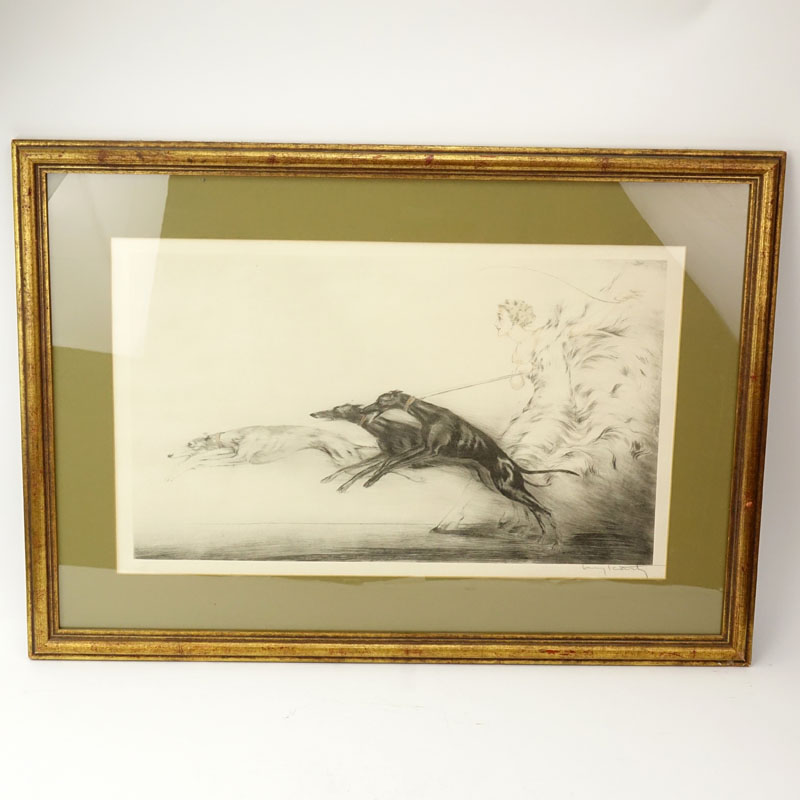 Louis Icart, French (1888-1950) Etching "Speed" Pencil signed lower right, blindstamp lower right. Good condition. Measures 16" x 25-1/2" (sight), frame measures 24-1/2" x 34-3/4". Shipping $185.00 (estimate $300-$500)