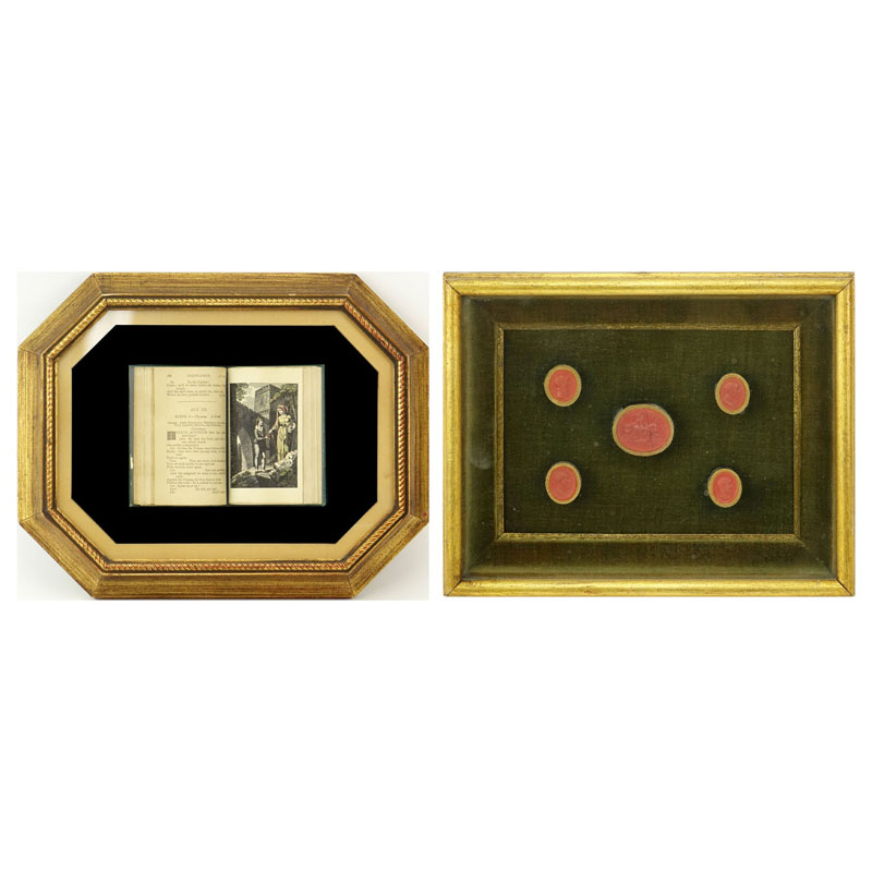 Grouping of Two (2) Framed Artworks. Includes: collection of Carnelian color Romanesque Intaglios, antique miniature book in shadowbox frame. Book appears to have some toning, intaglios appear to be in good condition. Largest measures 11-1/4" H x 14-1/4" W. Shipping $68.00 (estimate $150-$250)