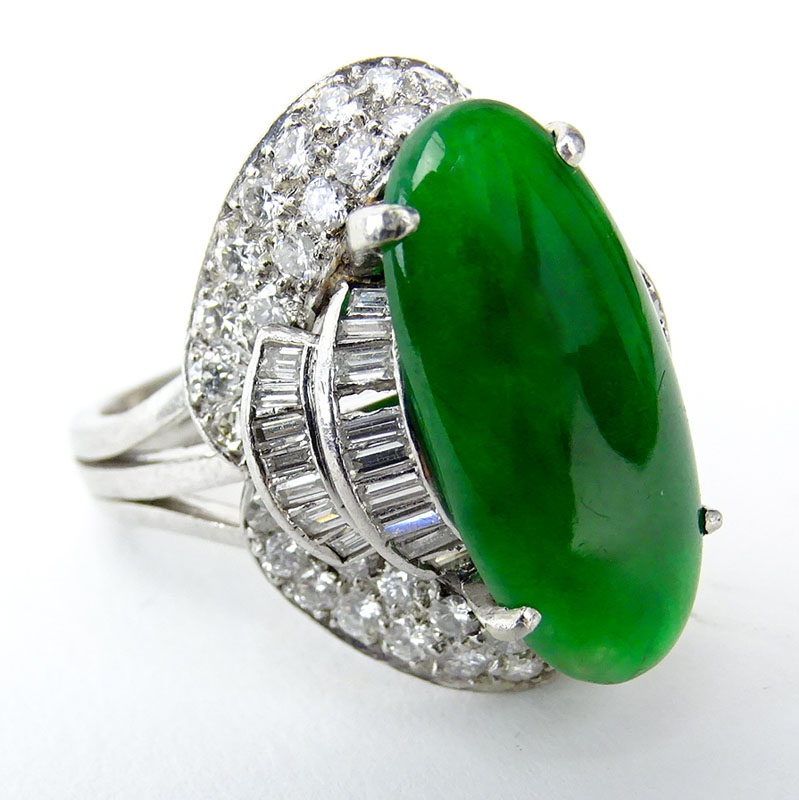 GIA Certified Art Deco Double Cabochon Jade and Platinum Ring. Set in the center with Oval Double Cabochon Jade. Jade with good natural green color. Accented throughout with numerous round and baguette cut diamonds. Diamonds F-G color, VS1-VS2 clarity. Ring size 6. Very good condition. Approx. weight: 11.4 grams. GIA Jade Report 2183022932 dated 12/1/16 to accompany this lot. Shipping $30.00 (estimate $5000-$8000)