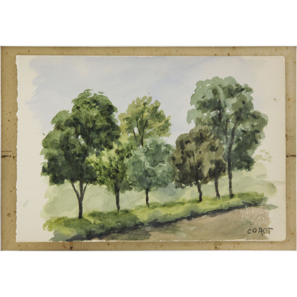 20th Century French School Watercolor on Paper, Tree Lined Path. Signed Corot lower right. Measures 4" H, 5-7/8" W. Shipping $36.00 (estimate $50-$100)
