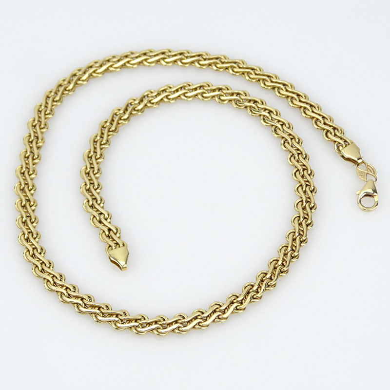 Italian 14 Karat Yellow Gold Link Necklace. Signed Italy and 14K. Good condition. Measures 17" l, 1/4" W. Approx. weight: 11.4 grams. Shipping $28.00 (estimate $200-$250)