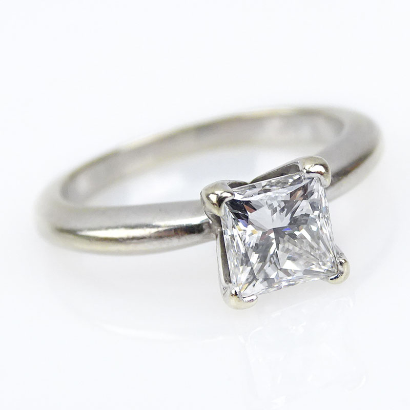 GIA Certified .91 Carat Princess Cut Diamond and 14 Karat White Gold Engagement Ring. Diamond E color, VVS2 clarity. Unsigned. Good condition. Ring size 3-3/4. Approx. weight: 2.8 grams. GIA Report 13022723 dated 2/10/2004 to accompany this lot. Shipping $30.00 (estimate $2000-$4000)