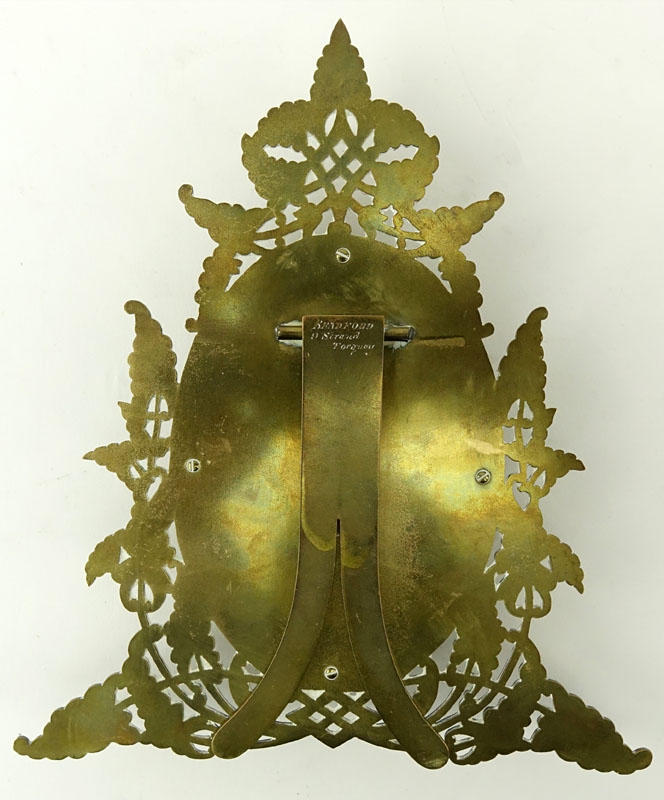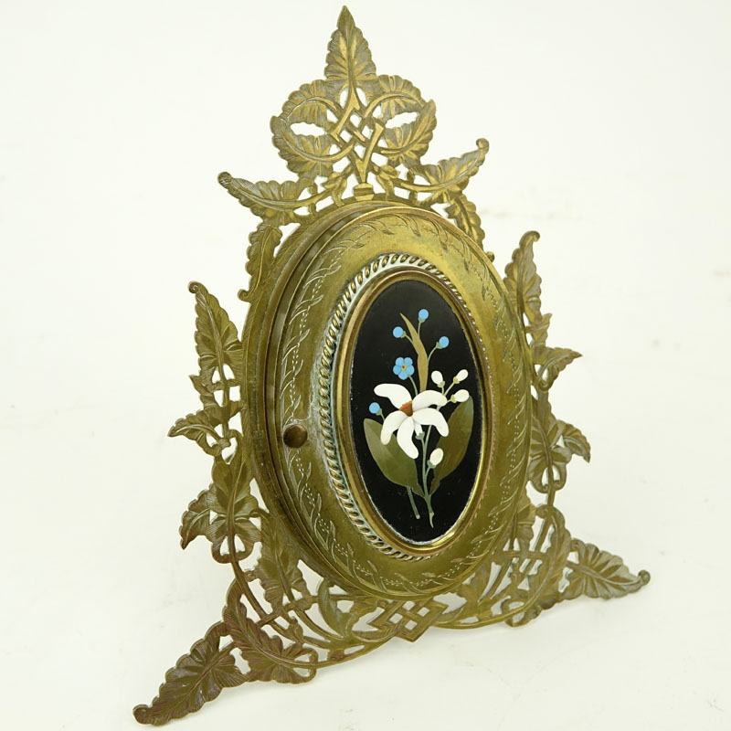 19/20th Century Victorian Style Pietra Dura and Gilt Brass Picture Frame. Floral openwork frame with pietra dura plaque mounted on door. Inscribed "Bradford, 9 Strand Torquay" on obverse side. Rubbing to brass. Measures 7" H x 6" W. Shipping $38.00 (estimate $150-$250)