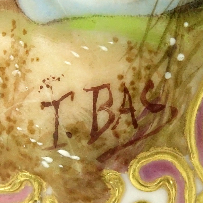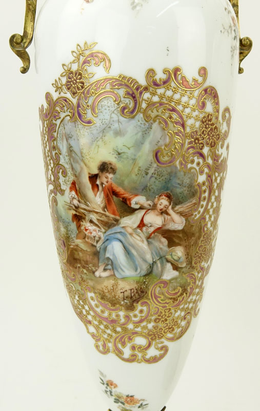 Pair Probably Sevres Hand Painted Porcelain Champleve Decorated Bronze Mounted Urns. Artist signed. One with lengthwise hairline crack, restoration, typical wear. Measures 21-1/4" H. Shipping $125.00 (estimate $600-$800)