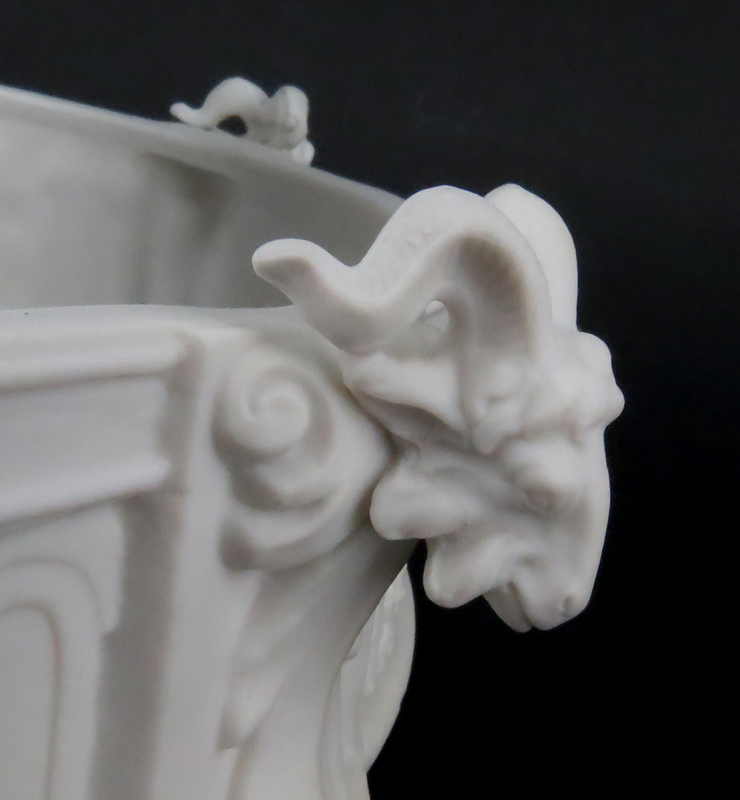 19/20th Century Sevres Style Bisque Porcelain Centerpiece. Unsigned, felt lining affixed on underside. A few old professional restorations, needs a minor cleaning. Measures 13-1/2" H x 13" Dia. Shipping: Third party. (estimate $300-$400)